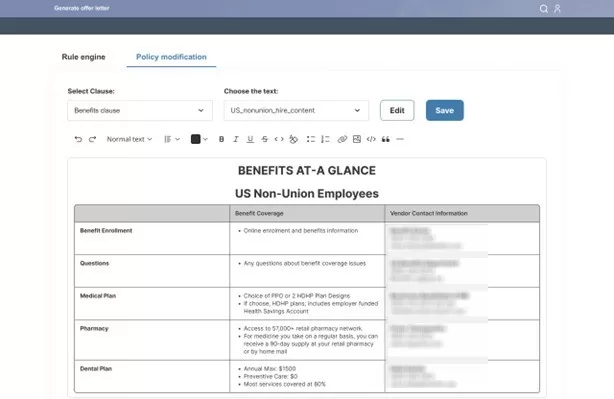 The solution also provided a self-service interface for end users in SAP SuccessFactors. This tool empowered them to configure offer letter clauses and manage conditions independently, creating a more efficient, user-friendly system.